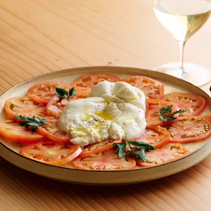 ナイフを入れた瞬間とろりと溢れ出す濃厚なミルクの香りの「ブッラータチーズ」。トマトやオリーブオイルと絡めて至福のひとときを楽しみましょう。