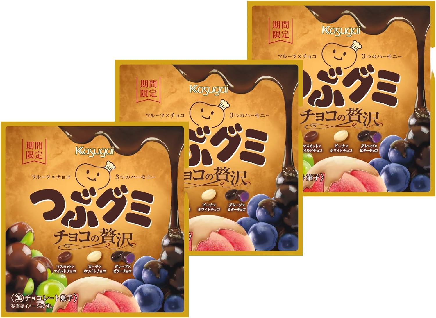 「つぶグミチョコの贅沢」は、ジューシーなつぶグミをチョコで包んだお菓子です。グミの弾力とチョコの甘さが絶妙に調和し食べ応えがあります。